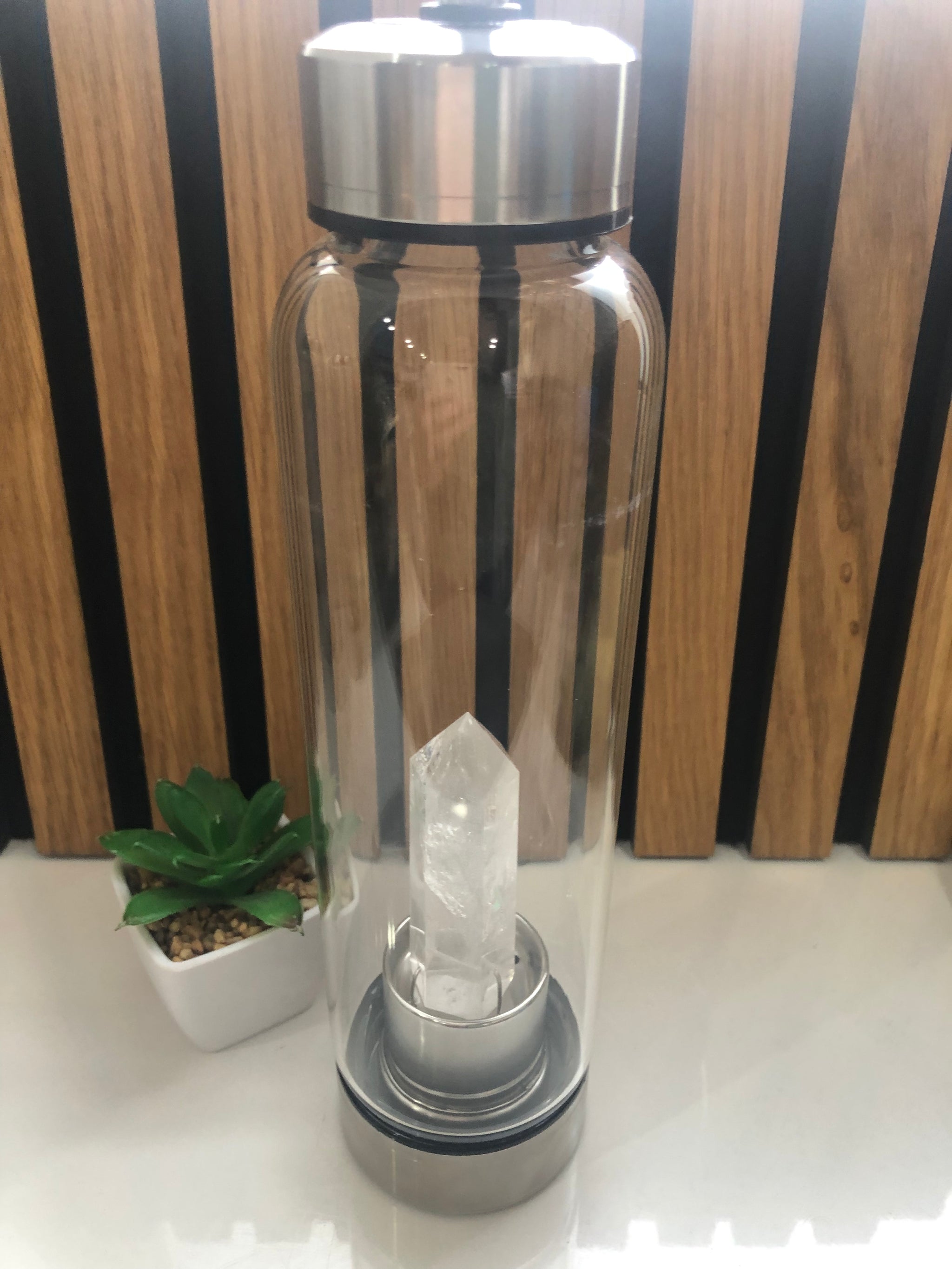 500ml Glass water bottles fitted with healing crystals to cleanse and energise your water with their healing properties.
