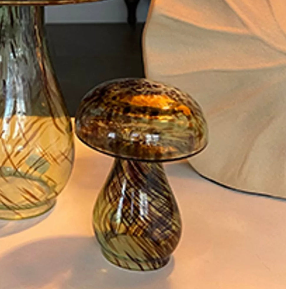 Bring charm to the consumer space with the Hestia Glass Mushroom - Small. Made from glass, this petite vase boasts a playful mushroom silhouette in soothing earth tones. The stem and cap are rich green and brown in colour, evoking woodland walks and the great outdoors. This charming vase makes a thoughtful gift for the nature lover. At just 10cm tall, it's perfect for windowsills, shelves and tabletops.
