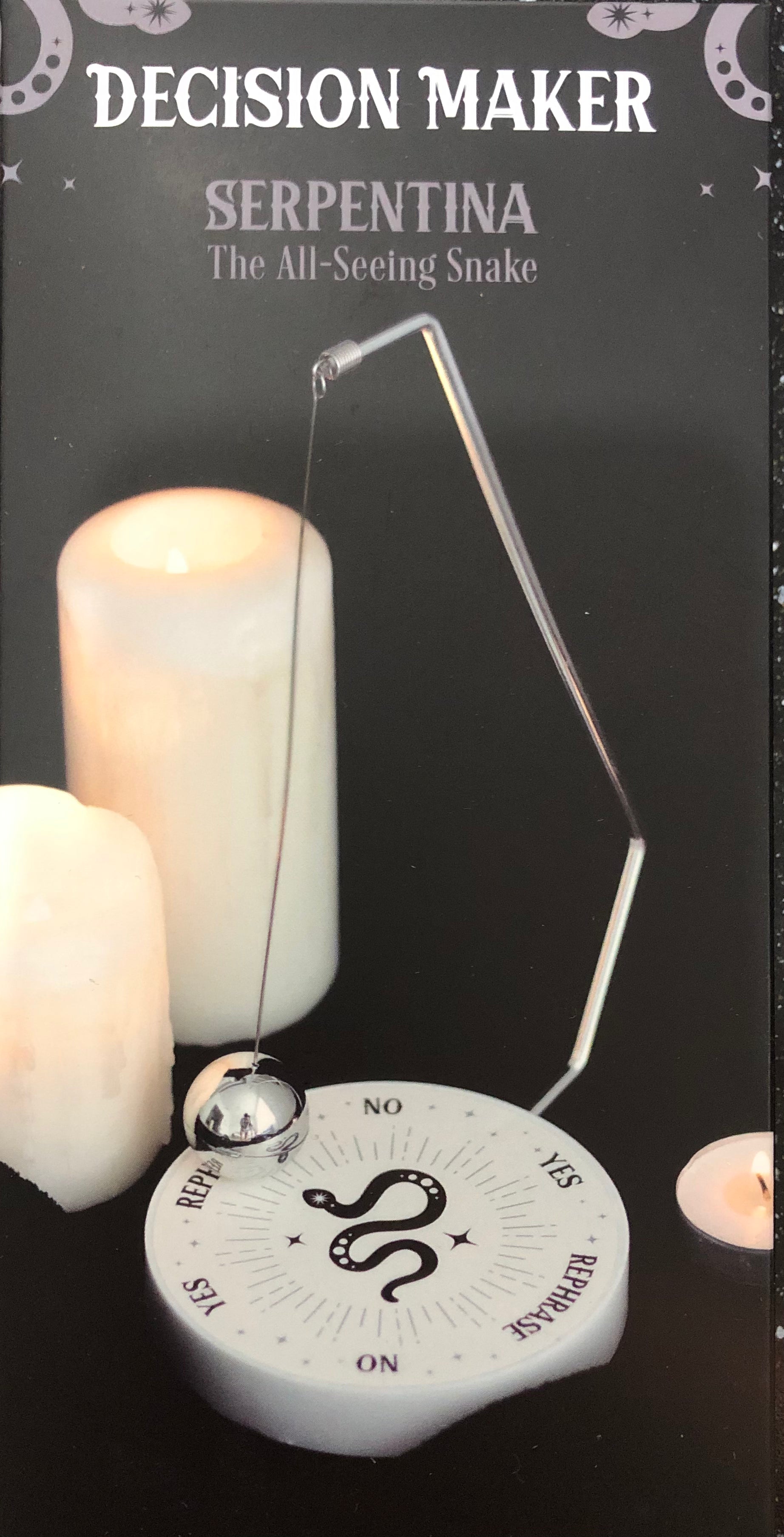 this metal decision maker features a spherical pendulum that magically selects one of six responses. Simply ask your desired 'yes' or 'no' question and watch as the pendulum cycles through the possible outcomes and lands on your destiny. Perfect in size for keeping on desktops and side tables for quick decision-making.